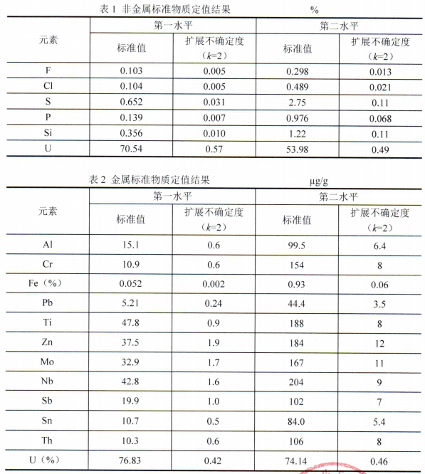 重鈾酸鹽標準物質情況說明 由核工業北京化工冶金研究院承擔的國防軍工計量“十一五”科研項目《重鈾酸鈉雜質元素標準物質研制》,研制周期:2009年7月-2013年6月,研制了 S、P、Cl、F、Si 5項非金屬雜項元素分析用重鈾酸鹽標準物質和Fe、Ti、Mo、Th、Cr、Sb、Nb、Pb、Al、Sn、Zn 11項金屬雜項元素分析用重鈾酸鹽標準物質,項目己結題,經過多家比對后,得到各元素的測量值及擴展不確定度(見表1和表2)