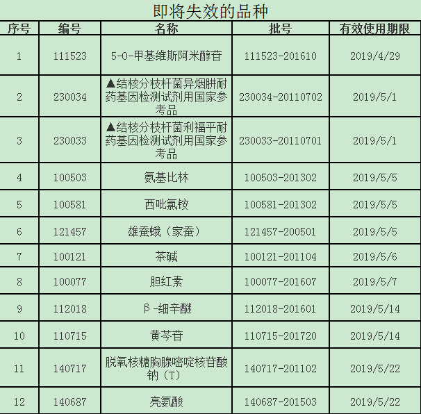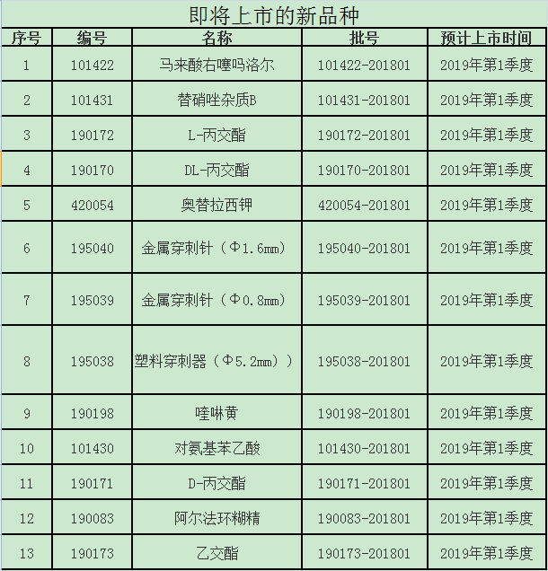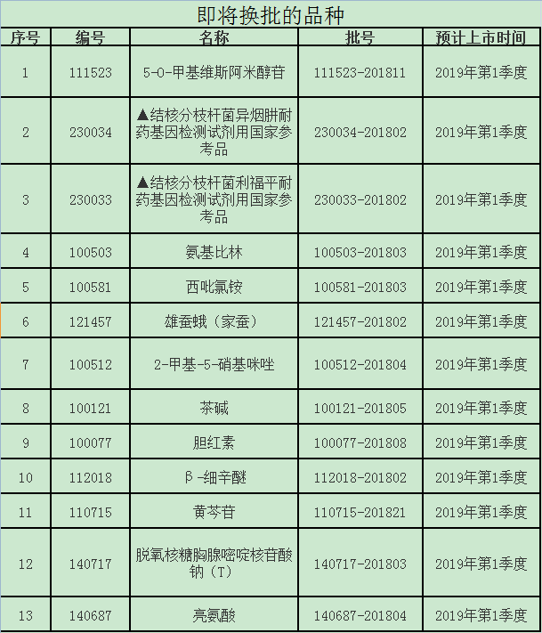 ? ? ? ? 2018年第十二期國家藥品標(biāo)準(zhǔn)物質(zhì)供應(yīng)新情況,包括13個即將上市的新品種,13個即將換批品種的預(yù)計(jì)上市時間、12個即將失效品種的有效使用期限和5個停用品種名單: